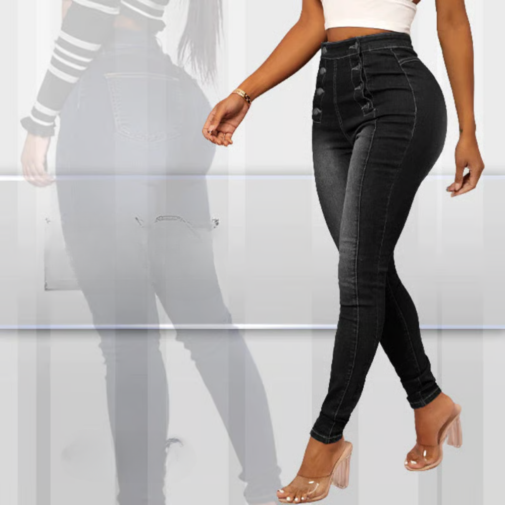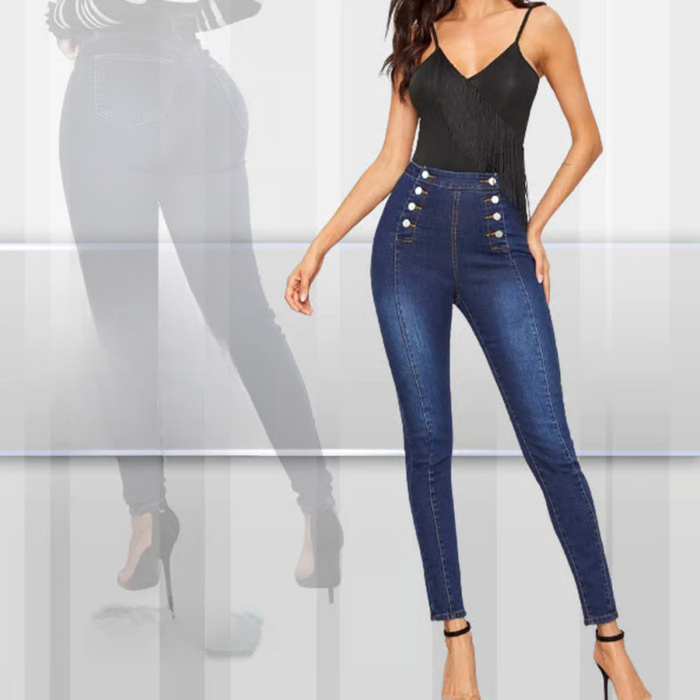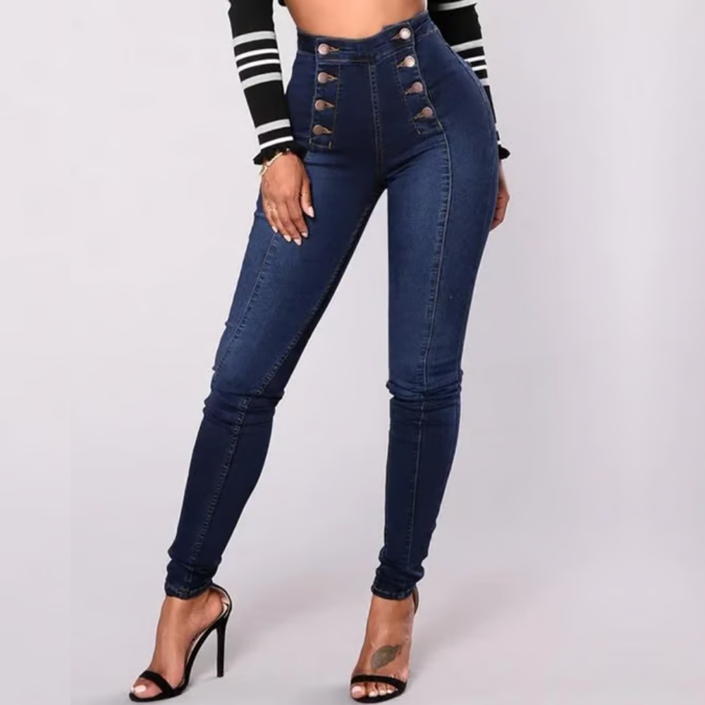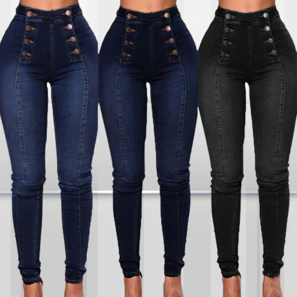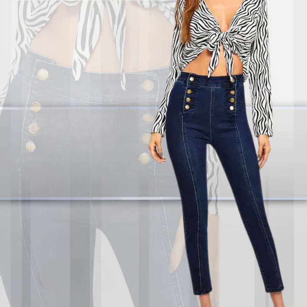De Nina Skinny Jeans is de broek voor wie op zoek is naar een vrouwelijke pasvorm met net dat beetje extra. De hoge taille en dubbele rij knopen zorgen voor een opvallend silhouet, terwijl de stretchstof zorgt voor ultiem comfort.